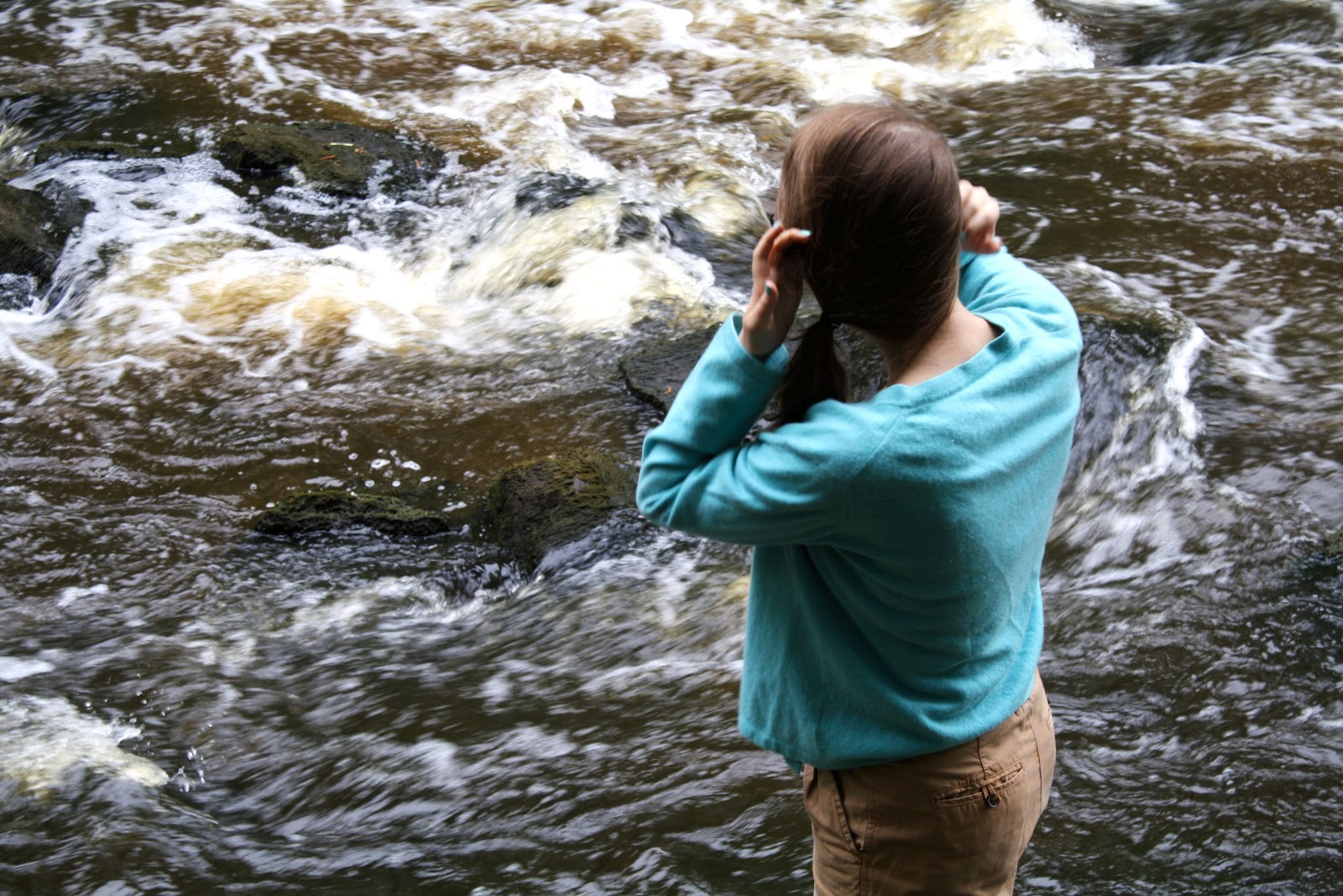 Lauantaina nukuimme myöhään, söimme kunnon aamupalan ja juttelimme pitkään ja hartaasti. Pitkät ja syvälliset keskustelut ystävien kanssa ovat aivan mahtavia, etenkin kun ne tapahtuvat kasvotusten eikä vain netin kautta. Sitten päätimme lähteä haukkaamaan raitista ilmaa siitäkin huolimatta, että sää ei ehkä ollut yhtä hyvä kuin edellisenä päivänä. Löysimmekin metsästä pienen kosken, ja meidän oli tietenkin